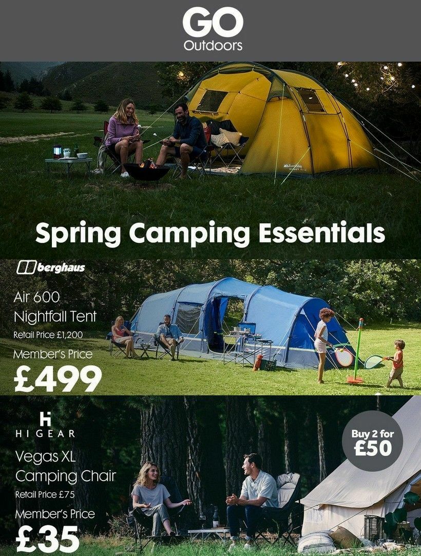 This page provides you with the latest offers & special buys for GO Outdoors. Offers start Tuesday 11/03 and expire Thursday 20/03/2025. You can browse through 15 pages. You are on page number 1. You have left before deals expire. Future deals will be available here on Friday 21/03/2025. GO Outdoors is preparing special offers to celebrate national holidays such as Boxing Day, Good Friday and Easter Monday. You will find the offers here. Please see Sports Direct Offers from 18 December (valid from Thursday 18/12 through Friday 09/01/2026) for more interesting offers. Additional information can be found at www.gooutdoors.co.uk or by dialing 0330 008 1555.